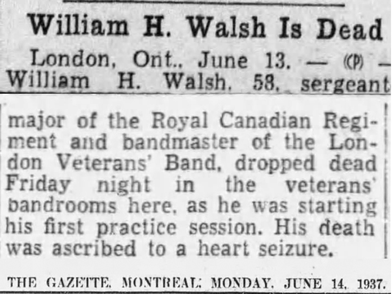 William Herbert died of heart failure, on June 11, 1937, at The London Armouries, in London, Ontario, while leading the Royal Canadian Regiment Veteran's Band. Death notices in the Gallery indicate his influence far and wide, and his death was felt and mourned by the community he flourished in for most of his life.