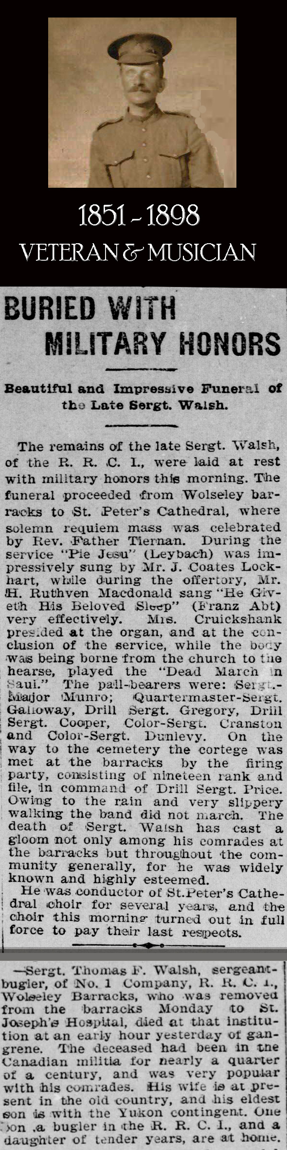 Thomas Francis Walsh spent the greater part of his life in the military, serving 12 years in India as a member of the 46th Northamptonshire Regiment, and 15 years in the permanent Canadian forces - 4 at Stanley Barracks in Toronto, and 11 at Wolseley Barracks in London. He was possessed of considerable musical talent, a leader of the Barracks band for several years, and the Conductor of St. Peter's Cathedral choir.